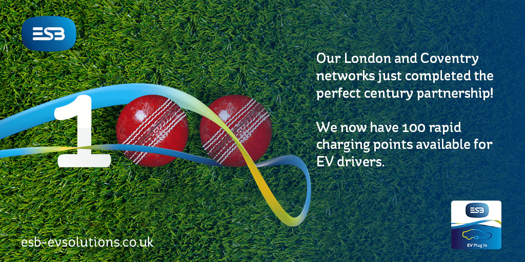 To celebrate 100 rapid charge points in Great Britain, ESB EV Solutions is running a competition on its Twitter channel. The lucky winner will get £100 worth of EV charging credit to use at any of our rapid chargers in Coventry and London. Since