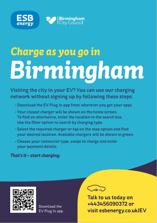 Travelling in your EV to Birmingham for the 2022 Commonwealth Games? ESB Energy has you covered with lots of chargers all over the city. No need to sign up for a price plan – charge and go with a one time payment option via the EV Plug In app.